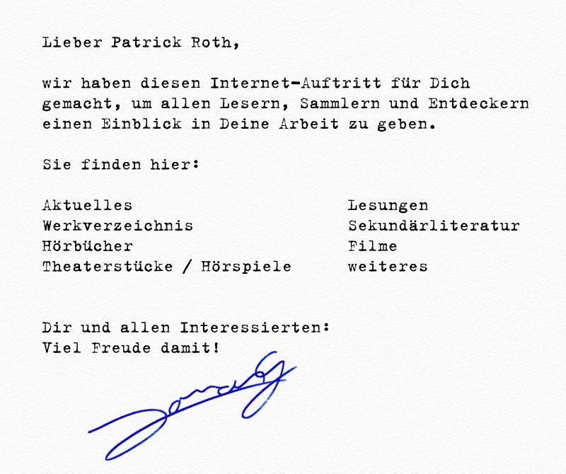 ... hier geht es zu den Veröffentlichungen in Büchern und Zeitschriften bzw. Festschriften ... hier geht es zu der Forschungsliteratur (Bücher über Patrick Roth) ... hier geht es zu der Auflistung der Hörbücher ... hier geht es zu der Auflistung der Uraufführungen von Patrick Roths Theaterstücken ... hier geht es zu der Auflistung der Filme ... hier geht es zu der Auflistung von weiteren Texte, Links, ... ... hier können Sie mehr über Patrick Roths Lebenslauf und seine Aktuellen Lesungen erfahren ... hier geht es zu einer Auflistung von Videos ... hier geht es zu der Auflistung der Hörspiele und ihrer Erstsendung