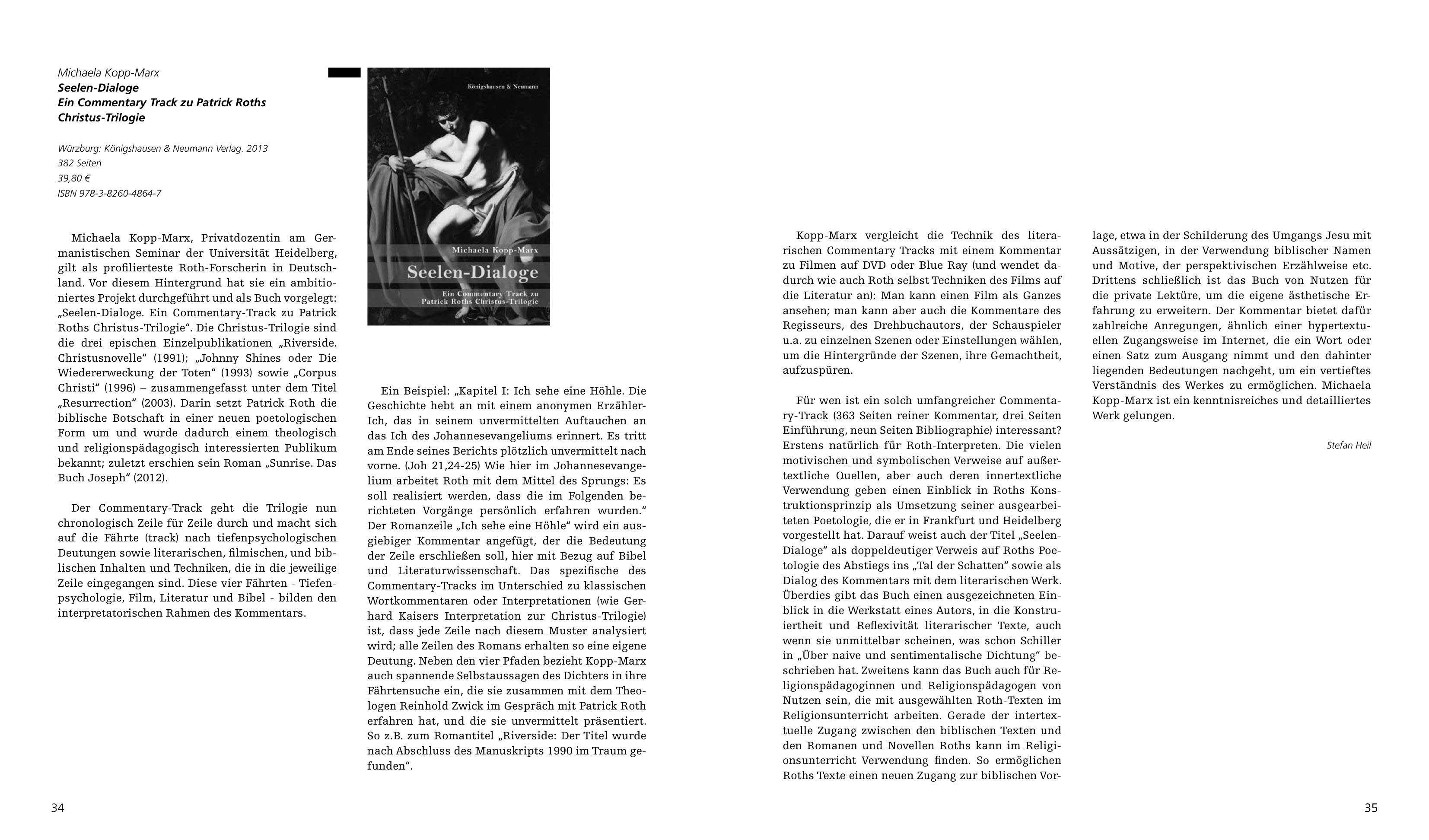 | zum JPG | Stefan Heil: "Michaela Kopp-Marx, Die Seelen-Dialoge: Ein Commentary Track zu Patrick Roths Christus-Trilogie" in EULENFISCH Literatur 2/2013 |